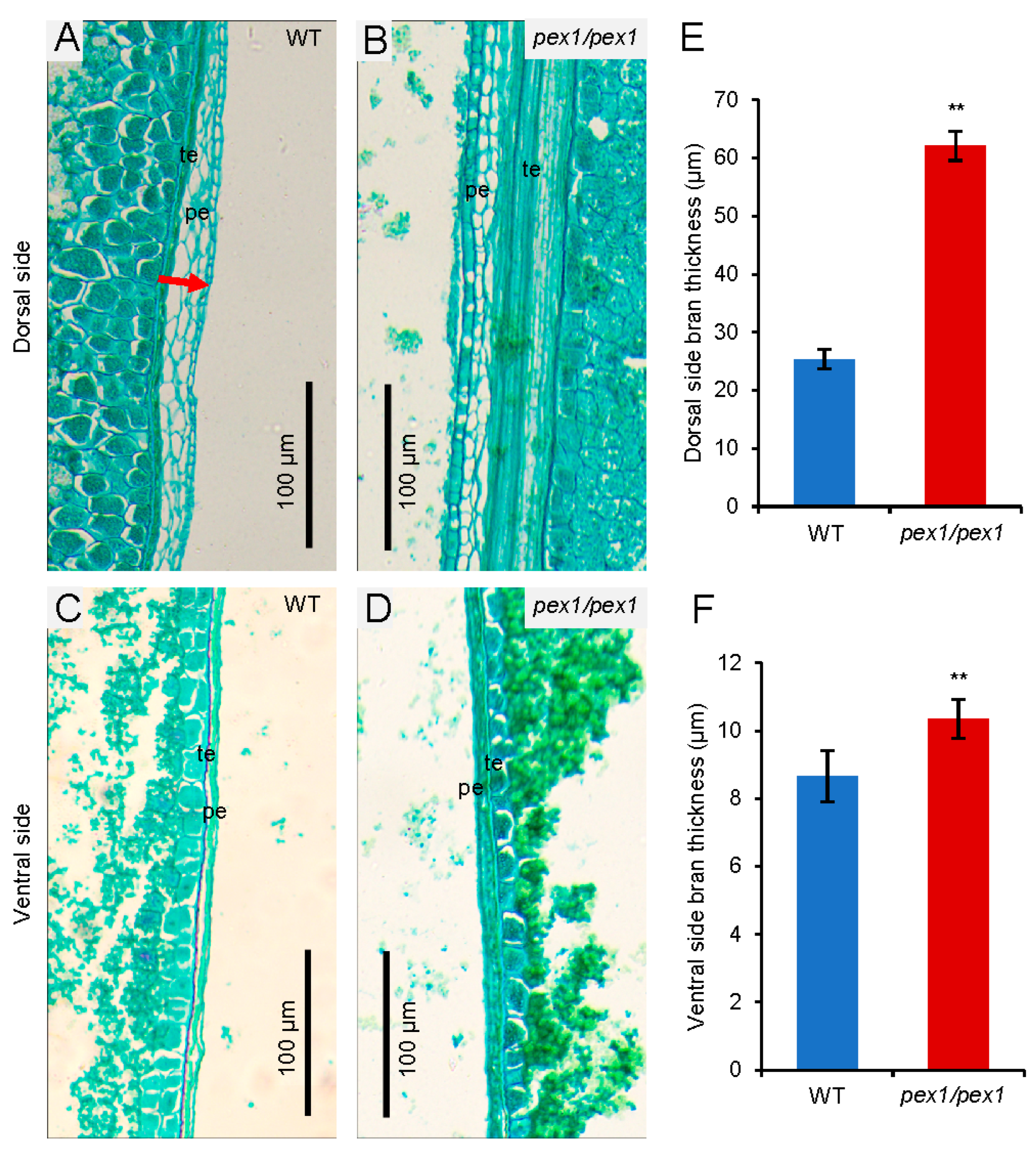 2.3. The pex1 Exhibits Thickened Bran at Mature Caryopsis