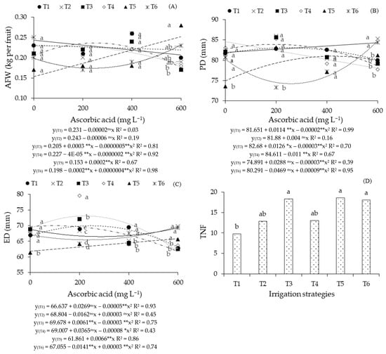 Average fruit weight—AFW (A), polar diameter—PD (B), equatorial diameter—ED (C), and total number of fruits per plant—TNF (D) of guava plant, as a function of saline water irrigation strategies and ascorbic acid (AsA) concentrations. Means followed by the same letter for a given ascorbic acid concentration do not differ significantly among treatments by the Scott-Knott test (p ≤ 0.05). T1—irrigation with moderately saline water throughout the growing cycle (1–390 days after transplanting—DAT); T2—application of saline stress during the vegetative phase (90–217 DAT); T3—flowering phase (218–293 DAT); T4—fruiting phase (294–390 DAT); T5—vegetative and flowering phases (90–217 and 218–293 DAT); T6—vegetative and fruiting phases (90–217 and 294–390 DAT). ns, **, * respectively not significant, significant at p ≤ 0.01 and p ≤ 0.05.