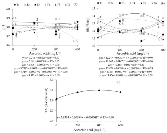 Hydrogen potential—pH (A) and soluble solids—SS (B), of guava pulp, as a function of saline water irrigation strategies and ascorbic acid (AsA) concentrations, and titratable acidity—TA (C) as a function of AsA concentrations. Means followed by the same letter for a given ascorbic acid concentration do not differ significantly among treatments by the Scott-Knott test (p ≤ 0.05). T1—irrigation with moderately saline water throughout the growing cycle (1–390 days after transplanting—DAT); T2—saline stress during the vegetative phase (90–217 DAT); T3—flowering phase (218–293 DAT); T4—fruiting phase (294–390 DAT); T5—vegetative and flowering phases (90–217 and 218–293 DAT); T6—vegetative and fruiting phases (90–217 and 294–390 DAT). ns, and ** respectively not significant, and significant at p ≤ 0.01.