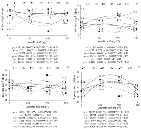 Regarding the reducing sugar contents (Figure 3A), it was observed that plants that did not receive AsA (0 mg L−1) and were irrigated with saline water during the vegetative (T2), vegetative/flowering (T5), and vegetative/fruiting (T6) phases reached the maximum values (12.93, 13.20, and 12.71 mg 100 g−1 of pulp), respectively. For strategies T1, T3, and T4, it was found that the highest values (13.19, 13.04, and 11.81 mg 100 g−1 of pulp) were obtained in plants subjected to foliar application of ascorbic acid at concentrations of 0, 210, and 303 mg L−1, respectively.