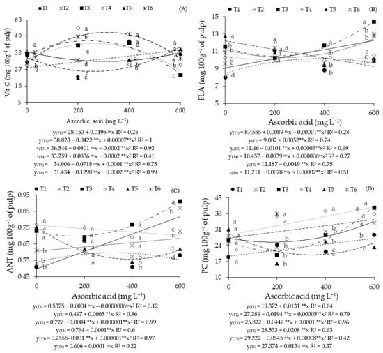 Content of vitamin C—Vit C (A), flavonoids—FLA (B), anthocyanins—ANT (C), and phenolic compounds—PC (D) as a function of saline water irrigation strategies and ascorbic acid (AsA) concentrations. Means followed by the same letter for a given ascorbic acid concentration do not differ significantly among treatments by the Scott-Knott test (p ≤ 0.05). T1—irrigation with moderately saline water throughout the growing cycle (1–390 days after transplanting—DAT); T2—saline stress during the vegetative phase (90–217 DAT); T3—flowering phase (218–293 DAT); T4—fruiting phase (294–390 DAT); T5—vegetative and flowering phases (90–217 and 218–293 DAT); T6—vegetative and fruiting phases (90–217 and 294–390 DAT). ns, and ** respectively not significant, and significant at p ≤ 0.01.