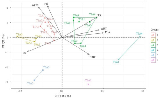 According to the principal component analysis (Figure 5), an explanation of 67.5% of the variation was observed in two principal components, with the first (PC1) representing 44.9%, with a positive correlation to ripening index (RI, r = 0.74) and a negative correlation to titratable acidity (TA, r = 0.74), flavonoids (FLA, r = 0.87), and anthocyanins (ANT, r = 0.78). This pattern was predominant in the treatments of group 4 and, to a lesser extent, in group 5. For the principal component 2 (PC2), a representation of 22.6% of the variation was observed, with a negative correlation to average fruit weight (AFW, r = −0.71) and polar diameter (PD, r = −0.73), and a positive correlation to total number of fruits (TNF, r = 0.40). The negative behavior of PC2 was also related to lower contents of FLA and ANT.
