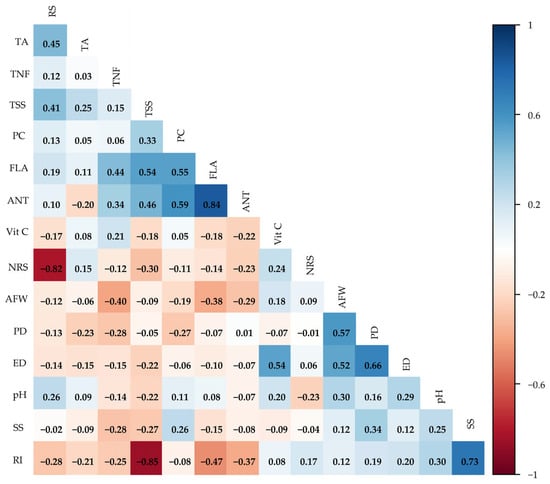 The Pearson correlation matrix (Figure 6) revealed interactions between production and quality variables of guava fruits under saline water irrigation strategies and ascorbic acid concentrations. The analysis of the Pearson correlation matrix revealed relevant associations among the analyzed variables. The strongest relationship was observed between RI and PC, with a negative correlation of r = −0.85. A very strong positive correlation was also verified between ANT and FLA (r = 0.84). Other strong correlations include TSS and RI (r = 0.73), and ED and PD (r = 0.66). Moderate relationships were observed between FLA and ANT (r = 0.59), PC and FLA (r = 0.55), AFW and PD (r = 0.57), and ED and AFW (r = 0.54). Furthermore, the negative correlation between TSS and RS (r = −0.62) is noteworthy.