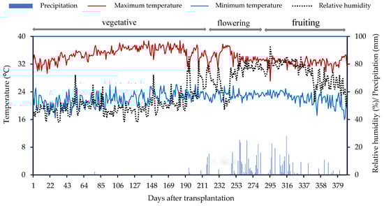 Fertilizer applications were made via fertigation every fifteen days. Micronutrients were applied weekly via foliar spray, starting at 10 DAT. During the vegetative phase, 0.5 g L−1 of Dripsol Micro® solution (Vitas Brasil, Candeias, Brazil) (composition: 1.2% magnesium, 0.85% boron, 3.4% iron, 4.2% zinc, 3.2% manganese, 0.5% copper, and 0.06% molybdenum) was applied and in the subsequent phases, concentration was raised to 1.0 g L−1.