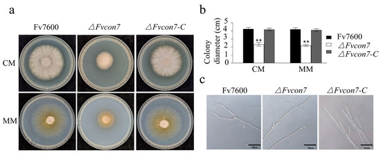 FvCon7 regulated the morphological vegetative mycelium growth of Fusarium verticillioides. (a) The colony growth of F. verticillioides 7600 (WT), ΔFvcon7, and ΔFvcon7-C on the complete medium (CM) and minimum medium (MM) 3 days after culture; (b) the growth of the WT as a control and the statistical analysis of colony diameter of the WT, ΔFvcon7, and ΔFvcon7-C; Asterisk indicates significant difference (**, p < 0.01, t-test). (c) the apical hyphal branches decreased in ΔFvcon7. Scale bar = 50 µm.