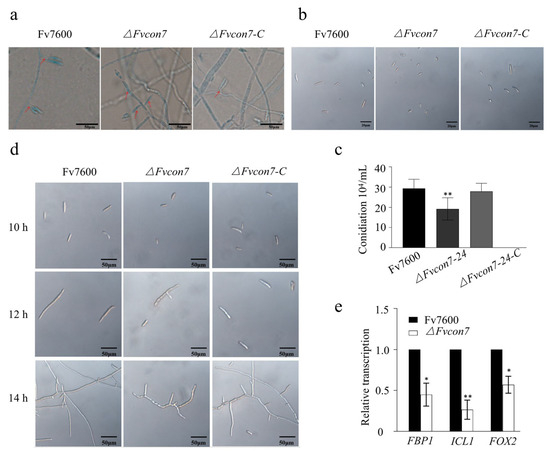 On the other hand, the morphology of conidiophore and conidia were observed, and the number of conidia were counted in the strains (Figure 2a–c). Compared to WT Fv7600 and ΔFvcon7-C, the conidiophore of the ΔFvcon7 mutant was much longer. The length of the conidiophore of the mutant was approximately twice that of the wild type (Figure 2a). However, the conidia were much smaller. The conidia length of the mutant was approximately one-third that of the wild-type and compensatory strains (Figure 2b). Furthermore, the number of conidia reduced in the ΔFvcon7 mutant (Figure 2c). The spore germination of strains was observed after 10, 12, and 14 h of incubation at 25 °C. The Fv7600 and ΔFvcon7-C spores exhibited polarization and the initiation of germination at 10 h, with a germination rate reaching approximately 50% at 12 h and near 100% at 14 h. However, the spores of ΔFvcon7 were not germinated at 10 h, and some of the mutant spores displayed polarization and tip sharpening at 12 h. However, after 14 h, the spore germination rate of ΔFvcon7 was still below 50%, significantly lower than that of Fv7600 and ΔFvcon7-C during the same time period (Figure 2d). Consequently, the expression levels of three spore germination-related genes (FvFBP1, FvICL1, and FvFOX2) were assessed by qRT-PCR. These three genes were found to be significantly down-regulated in the ΔFvcon7 (Figure 2e).