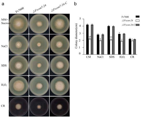 FvCon7 was involved in various stresses. (a) The colony growth of the WT, ΔFvcon7, and ΔFvcon7-C under different stress conditions. The strains were inoculated on MM with the addition of sucrose and further supplemented with various stress inducers (1.0 M NaCl; 0.01% SDS; 0.05% H2O2 and 200 μg/mL of Congo red, CR for 3 days at 25 °C); (b) using the growth inhibition rates of the WT as a control, stress inhibition rates under different stress conditions were analyzed. Error bars denote standard errors of three independent experiments. Asterisk means significant difference (*, p < 0.05, **, p < 0.01, t-test).