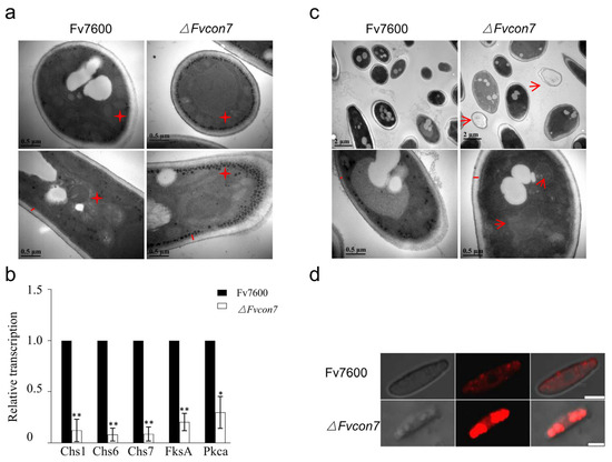 The WT Fv7600, ΔFvcon7 mutant, and complementing strain ΔFvcon7-C were cultured in CM with the addition of the cell wall formation inhibitor Congo red (CR), cell membrane stress factor sodium dodecyl sulfate (SDS), osmotic stress high-concentration NaCl, and oxidative stress H2O2, respectively, and the growth of ΔFvcon7 was significantly inhibited under the various stresses presented above (Figure 3a,b). To further assess the ability of resistance to cell wall-degrading enzymes, three-day-old mycelia from CM were treated with the cell wall-damaging agents driselase (0.1 g/10 mL) and lysozyme (0.5 g/10 mL) in lysis buffer. In Fv7600, mycelial cells started collapsing after 90 min of incubation, leading to the production of some protoplasts by 180 min. However, in the same condition, no collapsed cells or protoplasts were observed in ΔFvcon7. Compared to Fv7600, ΔFvcon7 is more resistant to driselase and lysozyme. Consequently, we observed the cell wall’s structure by electron microscope, and found that the cell wall of ΔFvcon7 was thicker than that of the wild type (Figure 4a). However, the expression levels of five cell wall synthase genes, FvCHS1 (FVEG_02839), FvCHS6 (FVEG_07280), FvCHS7 (FVEG_07296), FvFSA (FVEG_12144), and FvPKCA (FVEG_06268), in ΔFvcon7 were significantly reduced following detection by qRT-PCR (Figure 4b).