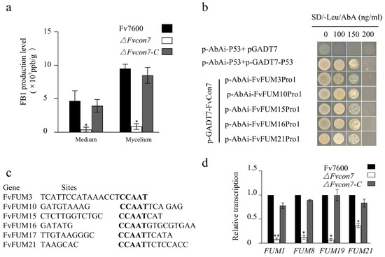 FvCon7 as a transcription factor involved in the FB1 product. (a) The FB1 product was quantified and statistically analyzed using the amount of FB1 produced by the WT as the control; (b) yeast one-hybrid showing FvCon7’s binding ability to the promoter sequence of FUM3, 15, 16, 17, 21; (c) FvCon7 can bind the promoters of the six FUM genes at the CCAAT site by Multiple EM for Motif Elicitation (MEME 5.4.0) software; (d) the relative expression levels of the FB1 biosynthesis-related genes (FUM1, 8, 19, 21) in the ΔFvcon7 mutant were detected and compared to those in the WT. Error bars denote standard errors of three independent experiments. Asterisk means significant difference (*, p < 0.05; **, p < 0.01, t-test).