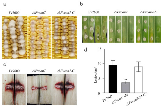 FvCon7 is involved in virulence. Various Fusarium verticillioides strains were used, including ΔFvcon7, the complementary strains con7-C, and WT Fv7600. (a) Virulence assay on maize cob. Kernels of a maize cob (susceptible cultivar B73) were puncture-inoculated using a needle dipped in a conidial suspension and incubated for 3 d; (b) virulence assay on leaf. The maize leaves (B73) were inoculated with mycelial discs for 3 d; (c) virulence assay on sugarcane (R570) stem. Sugarcane stems were split longitudinally to visually inspect rot symptoms after 7 dpi. The sugarcane stem was inoculated by immersing the conidia tooth tip at the internodal region; (d) the area of discoloration of the split longitudinal section of sugarcane was quantified by Image J software and statistically analyzed with the discolored area of the WT infected sugarcane as the control. Error bars denote standard errors of three independent experiments. Asterisk means significant difference (**, p < 0.01, t-test).