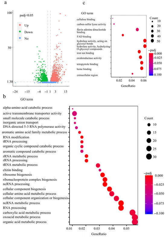 Given FvCon7’s role as a transcription factor involved in regulating growth, plant pathogenicity, and fumonisin B1 (FB1) production, we sought to identify its downstream target genes to elucidate the mechanisms underlying these phenotypes. In order to comprehensively investigate the diverse function of FvCon7, the transcriptome RNA of wild-type Fv7600 and mutant ΔFvcon7 was sequenced (RNA-seq), and differentially expressed genes (DEGs) were analyzed at the maize kernel-infested stage, as in the study of Peng (2024) [20]. According to the RNA-seq data, there were 2625 up-regulated genes and 1880 down-regulated genes in ΔFvcon7 compared with Fv7600 (Figure 7a).