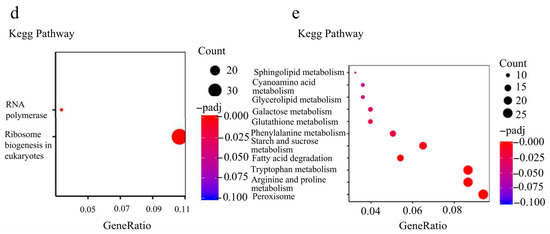 GO annotation and KEGG enrichment pathways were further analyzed in DEGs [21,22]. The down-regulated DEGs were enriched to 25 GO terms (Figure 7b), and the top 5 down-regulated GO terms were mainly associated with organic acid metabolic process, oxoacid metabolic process, carboxylic acid metabolic process, ncRNA processing, and RNA processing. The 25 GO terms in down-regulated DEGs belong to three levels: biological process level involving RNA synthesis; cellular component level encompassing the plasma membrane, Golgi apparatus, and nucleus; and molecular function level mediating chitin binding, active transmembrane transporter activity, and DNA-directed 5′-3′ RNA polymerase activity. As for the KEGG pathways, the down-regulated DEGs were only enriched to ribosome biogenesis and RNA polymerase (Figure 7d). The up-regulated DEGs enriched 11 GO terms (Figure 7c), and the top 5 up-regulated enrichment pathways were associated with hydrolase activity, acting on glycosyl bonds, hydrolase activity, hydrolyzing O–glycosyl compounds, heme binding, tetrapyrrole binding, and oxidoreductase activity/acting on paired donors/with the incorporation or reduction of molecular oxygen. The 11 GO terms in the up-regulated DEGs belong to three levels: biological process level involving protein phosphorylation, nucleotide metabolic process, and polysaccharide metabolic process; cellular component level encompassing an extracellular region, proton-transporting two-sector ATPase complex, and endoplasmic reticulum membrane; and molecular function level mediating heme binding, oxidoreductase activity, acting on paired donors, with the incorporation of or reduction in molecular oxygen, iron ion binding, and hydrolase activity/hydrolyzing o–glycosyl compounds (Figure 7c). The up-regulated DEGs were enriched to 11 KEGG pathways, and the top 5 DEGs were peroxisome, arginine and proline metabolism, tryptophan metabolism, starch and sucrose metabolism, and fatty acid degradation (Figure 7e). The analysis of enrichment pathways, combining both GO and KEGG enrichment, showed that the deletion of FvCON7 affects transcription, RNA processing, the cell wall, carbon metabolism, and peroxisome.