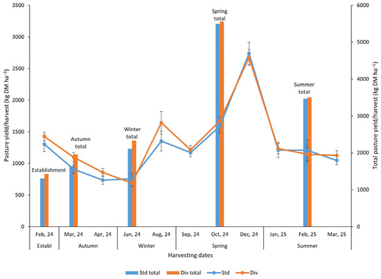 Pasture yield (kg DM ha−1) on every harvesting date and total pasture yield for each season (bar chart) in standard (Std) and diverse (Div) pasture treatments throughout the study. The error bar represents the standard error (n = 6). Note: Pasture yield (kg DM ha−1) did not show any significant differences (p < 0.05) between the pasture systems in each of the harvesting events.
