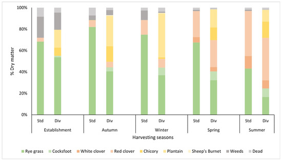 Pasture composition (%) of each species across harvest seasons in standard (Std) and diverse (Div) pasture treatments throughout the study. The X-axis represents the harvest date, while the Y-axis represents the percentage of dry matter contributed by each pasture species. Grasses include ryegrass (Lolium perenne) and cocksfoot (Dactylis glomerata); legumes include white clover (Trifolium repens), red clover (Trifolium pratense); other herbaceous species include plantain (Plantago lanceolata), chicory (Cichorium intybus), and sheep’s burnet (Sanguisorba minor). Weeds represent plant species not part of the sown seed mix, and dead material represents samples with over 50% dry, brown plant material.