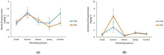 Soil mineral N (mg kg−1) changes at each harvesting season in standard (Std) and diverse (Div) pasture treatments throughout the study. (a) Nitrate concentration and (b) ammonia concentration. The error bar represents the standard error (n = 6). Note: Both nitrate N and ammonium N concentrations did not show any significant differences (p < 0.05) between the pasture systems in each season.