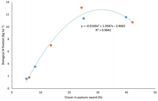 The relationship between clover proportion and BNF followed a non-linear trend in both standard and diverse pastures (Figure 4). As clover composition increased, BNF also rose, reaching an apparent optimum at around 30% clover cover. This suggests that moderate clover presence effectively supports symbiotic N fixation, likely due to optimal resource competition and balanced species interactions. However, when clover cover exceeded 35%, BNF plateaued and began to decline. This reduction may be attributed to increased N transfer from legumes to the soil, which, in the context of a reduced non-legume population, could not be effectively utilized [25,53]. As a result, mineral N accumulation in the soil may have suppressed further N fixation by legumes through feedback inhibition. These findings underscore the importance of maintaining a balanced clover composition in mixed sward systems to optimize N fixation and nutrient use efficiency.