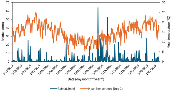 Daily total rainfall (mm) and mean air temperature (°C) at the study site during the experimental period from 1 November 2023 to 12 March 2025. Climatic data for the experimental period at the site was downloaded from the National Institute of Water and Atmosphere (NIWA) database [54]. The NIWA data for the Manawatū site was sourced from station number 3925, which is located approximately 300 m from the experimental site.