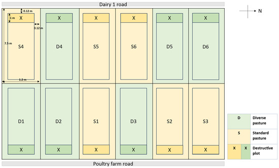 The pastures were established in plot sizes measuring 7.5 m × 1.2 m (9 m2). The treatments were arranged in a randomized complete block design (RCBD), and each treatment was replicated six times. A narrow strip within each paddock was designated (1.2 m2) for destructive pasture sampling. Between each paddock and the edge of the paddock, there was 0.12 m of walking space (Figure 6).