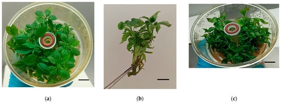 Effect of activated charcoal in shoot quality of ‘Golden Delicious’ cultured for 10 weeks in RITA® bioreactors. (a) Shoot rooted spontaneously in the multiplication medium. (b,c) Aspect of leaves cultured with (b) or without activated charcoal. Bars = 1 cm.