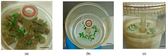 Explants were either placed directly on the bioreactor net or maintained in an upright position by placing them between 1 cm3 rockwool cubes (Grodan, Roermond, the Netherlands) or inserted into plastic slots in custom-made holders. In some cases, RITA® baskets were partitioned with aluminum foil to accommodate different support conditions within the same vessel as described for oak [65]. In TIS and CIS rooting experiments, custom-made slots as well as rockwool cubes of 1 and 2 cm3 (Grodan, Roermond, The Netherlands) were evaluated. Shoots were inserted in the 2 cm3 cubes or placed between the 1 cm3 cubes as in the multiplication stage.