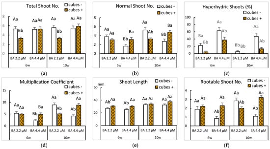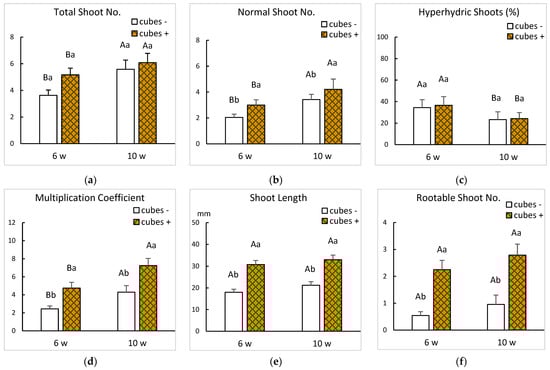 Effect of subculture duration on the growth parameters of Royal Gala shoots cultured in bioreactors with or without cubes. Shoots were immersed 6 times per day for 60 s, and data were recorded 6 and 10 weeks after starting the experiment. (a) Number of total shoots per explant. (b) Number of normal shoots per explant. (c) Percentage of hyperhydric shoots per explant. (d) Multiplication coefficient. (e) Length of the longest shoot per explant. (f) Number of rootable shoots per explant. Means ± standard error were calculated from 3 replicates, each with 8 shoots per treatment (n = 24). Different uppercase letters indicate significant differences regarding the duration of subculture, and different lowercase letters indicate significant differences regarding the use of support (p ≤ 0.05).