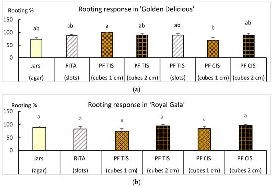 Effect of the culture system on the root formation of ‘Golden Delicious’ (a) and ‘Royal Gala’ (b). Shoots were treated for 5 weeks with MS ½ macronutrients, 3% sucrose and 4.9 µM indole-3-butyric acid, either in jars with agar or in bioreactors with liquid medium. RITA® bioreactors were operated by TIS (6 immersions per day) and Plantform™ (PF) either by TIS (6 immersions plus 9 aerations) or CIS (15 aerations). Duration of immersions and aerations were 60 s. Shoots were placed between plastic slots (Figure 2) or 1 cm3 rockwool cubes or inserted in 2 cm3 rockwool cubes. Means ± standard error were calculated from 3 replicates, each with 7 shoots per treatment (n = 21). Different letters indicate significant differences (p ≤ 0.05).