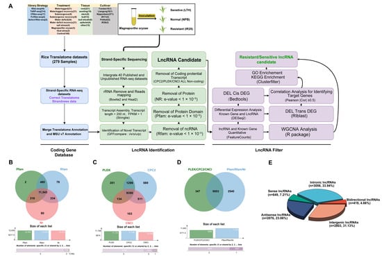 Bioinformatics pipeline for lncRNA identification and visualization of disease-resistance-associated lncRNAs in rice. (A) Comprehensive analysis workflow: sequential steps from left to right, illustrating the construction of the “CodingRNA” dataset, criteria and processes for identifying non-coding RNAs (including lncRNAs), and strategies for screening disease-resistance-associated lncRNAs. (B–D) Venn diagrams: evaluation of coding potential of transcripts using multiple tools and databases, including Pfam, Rfam, Nr, PLEK, CPC2, and CNCI. (E) Pie chart: classification of the final identified lncRNAs.