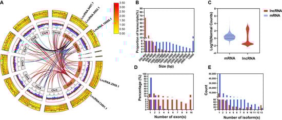 Comparative analysis of the basic characteristics of lncRNAs and mRNAs. (A) Circos plot of the trans-putative target genes of four specific lncRNAs. From innermost to outermost: the first ring represents chromosomes, the second ring shows GC content (outer side for lncRNAs, inner side for mRNAs), and the third ring displays heatmaps of gene expression levels and line graphs of gene density (outer side for lncRNAs, inner side for mRNAs). Trans-target gene connections are represented by lines. (B) Transcript length distribution. (C) Normalized expression level distribution, displayed as violin plots. (D) Distribution of the number of exons per transcript. (E) Distribution of the number of splice variants per gene locus. Red represents lncRNAs, and blue represents mRNAs.