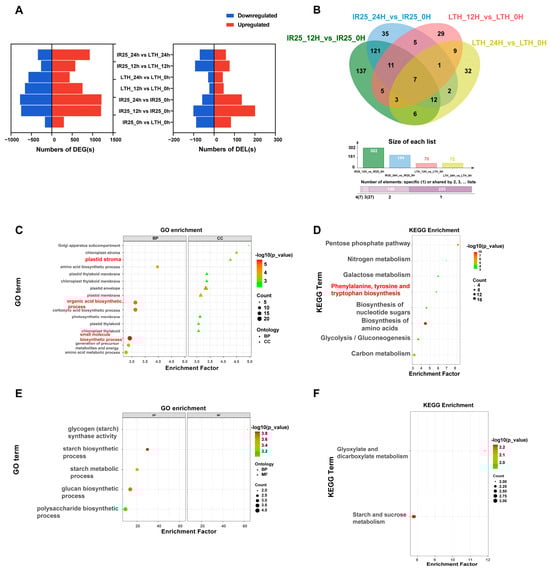 Functional enrichment analysis of DELs and their target DEGs in IR25 and LTH after rice blast infection. (A) Bar charts showing the number of DEGs and differentially expressed lncRNAs (DELs), with upregulated genes in red and downregulated genes in blue. (B) Venn diagrams of differentially expressed lncRNAs (DELs) between LTH and IR25 before and after inoculation (fold change > 1.5, p-value < 0.05). (C–E) Functional analysis of putative target genes predicted for uniquely expressed DELs in IR25 and LTH, including GO enrichment analysis (D,F) and KEGG pathway enrichment analysis. The top 20 significant GO terms were selected based on a p.adjust < 0.05 cutoff, and the top 10 KEGG pathways were selected with the same significance threshold.
