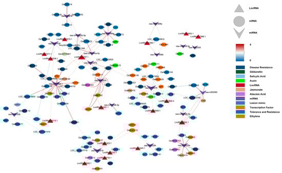 Co-expression ceRNA network of lncRNAs, miRNAs, and mRNAs. Inverted triangles represent miRNAs (purple), triangles represent lncRNAs (red), ovals represent mRNAs, and rectangles represent plant hormones, disease resistance-related genes, and transcription factors (orange). Solid lines indicate connections between miRNAs and mRNAs, while dashed lines represent interactions between miRNAs and lncRNAs. The line color corresponds to the expectation values predicted by psRNAtarget.