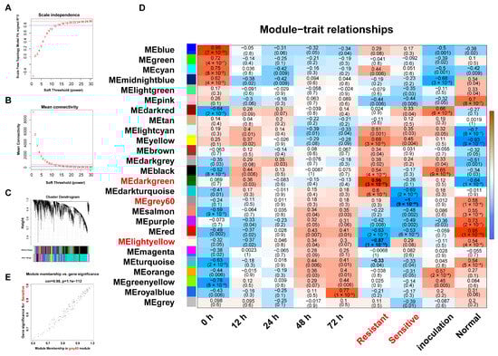 WGCNA of genes and lncRNAs in rice after M. oryzae infection. (A,B) Soft threshold selection for network construction. The optimal soft threshold was chosen based on scale-free topology fit (A) and mean connectivity (B). (C) Hierarchical clustering tree of transcripts in different modules. The dendrogram shows the clustering of transcripts into modules, with each module labeled by a different color. (D) Module–trait relationship. The heatmap shows the correlation between module eigengenes and traits. The correlation coefficients and p-values indicate the strength and significance of the relationship. (E) Scatter plots of transcript significance (TS) versus module membership (MM) for the salt-associated module MEgreys60.