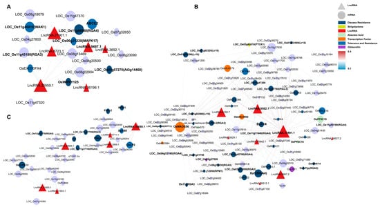 Collectively, these ceRNA interactions suggest that lncRNAs may be involved in hormone pathways (ABA, ET, JA, and IAA) and receptor kinases networks associated with rice blast resistance.