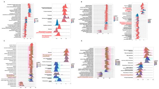 GSEA of gene sets based on four lncRNAs in GO and KEGG pathways: (A) lncRNA.9497.1, (B) lncRNA.9562.1, (C) lncRNA.10688.1, and (D) lncRNA.13491.1. The x-axis represents the enrichment score (ES), while the color gradient indicates the adjusted p-value (p.adjust), reflecting the significance level of the enrichment.