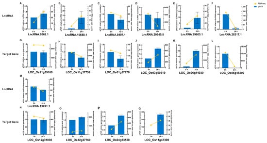 Verification of RNA-seq data by qRT-PCR for DELs and their putative target genes responsive to M. oryzae. (A–F) Expression levels of lncRNAs LncRNA.9562.1 (A), LncRNA.10688.1 (B), LncRNA.9497.1 (C), LncRNA.20645.5 (D), LncRNA.29605.1 (E), and LncRNA.28317.1 (F) at 0 and 24 h post-inoculation (hpi), except for (C) which shows 0 and 12 hpi. (G–L) Expression levels of the corresponding target genes LOC_Os11g39160 (G), LOC_Os11g37759 (H), LOC_Os01g57270 (I), LOC_Os03g50310 (J), LOC_Os06g14030 (K), and LOC_Os05g48200 (L) at the same time points as their respective lncRNAs in (A–F). (M–Q) Expression levels of lncRNA LncRNA.13491.1 (M) and its corresponding target genes LOC_Os12g31830 (N), LOC_Os12g37760 (O), LOC_Os04g53120 (P), and LOC_Os11g47300 (Q) at 0 and 24 hpi. The yellow line with solid triangles represents RNA-seq results, and the blue solid squares represents qRT-PCR results. Error bars indicate the standard error of three replicates.