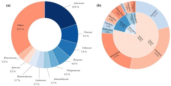 (a) Composition of families of spontaneous plants in Changchun. (b) The composition of species origins and dispersal modes of spontaneous plants in Changchun.