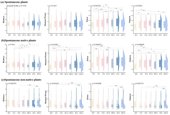 Diversity indices of various spontaneous plant categories in various kinds of green spaces. Note: *** p < 0.001; ** p < 0.01; * p < 0.05. B-F: brownfield site; I-G: affiliated green space; P-G: park green space; PL-G: square green space; PR-G: protective green space; R-G: road green space; RE-G: residential green space.