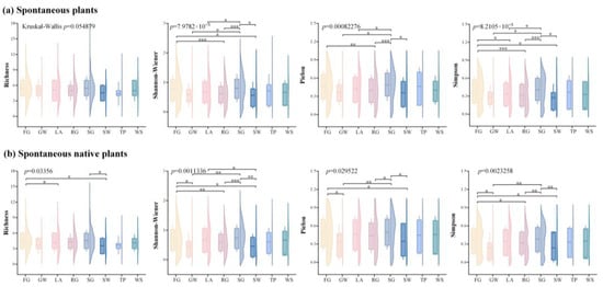 Diversity indices of several spontaneous plant species on various types of habitats. Note: *** p < 0.001; ** p < 0.01; * p < 0.05. FG: forest gap; GW: gravel wasteland; LA: lawn; RG: road gap; SG: scrub gap; SW: soil wasteland; TP: tree pool; WS: water side.