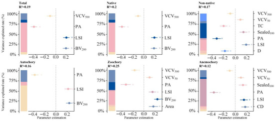 Furthermore, both horizontal and vertical dimensions of urbanization jointly affected spontaneous plant richness. In the horizontal dimension, Sealed100 (the proportion of impervious surface within a 100 m buffer zone around the patches) was significantly positively correlated with the richness of non-native plants (p < 0.05; Figure 4; Table 1). For anemochorous plants, CD (Distance from patch to city center) positively correlates (p < 0.05) with the richness. In the vertical dimension, BV200 (total building volume within a 200 m buffer zone around the patches) was significantly positively correlated with the richness of total, native, autochorous, and zoochorous plants (p < 0.05). Additionally, VCV500 (building volume coefficient of variation around the patches within a 500 m radius) was significantly positively associated with the richness of total and zoochory (Figure 4; Table 1).