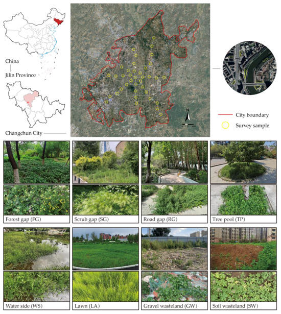 The urban boundary was delineated using 2020 ESA World Cover Sentinel-2 data, identifying areas with impervious surfaces covering ≥50% through a 1 km × 1 km moving window analysis in Fragstats 4.2 [71]. Eight radial transects were set up from Changchun’s city center, with circular sample sites (400 m radius) placed every 2 km, totaling 38 sites. In each survey site, 6–7 accessible urban green space patches were randomly selected for detailed plant community surveys. Moreover, the selected patches will cover as many different types of green spaces as possible to ensure that no data are omitted. These surveys documented the woody layer coverage and the type of green space in each patch. A total of 245 urban green space patches were surveyed from June to August in 2023 and 2024. In each patch, at least two herbaceous plots with a 1 m × 1 m size were established for typical community sampling, recording the plant species present, their maximum height and cover, the overall height and cover of the community, and the habitat type (Figure 5; Table 2). In total, 1147 herbaceous plots were surveyed.