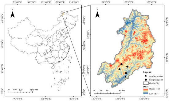 Forest communities in the region exhibit distinct vertical and horizontal distribution patterns. Larix gmelinii, a cold- and drought-tolerant pioneer species, dominates in both pure and mixed stands, forming typical forest types including Ledum palustre–Larix gmelinii, herb–Larix gmelinii, and riparian–Larix gmelinii forests. Ledum palustre–Larix gmelinii forests are commonly found in poorly drained low-lying wetlands, where the acid tolerance and water-retention capacity of the understory Ledum palustre help maintain the stability of the soil carbon pool [34]. Herb–Larix gmelinii forests occur on relatively gentle slopes, where seasonal herb growth significantly influences understory carbon cycling rates. Riparian–Larix gmelinii forests, supported by abundant water availability in riparian zones, exhibit greater potential for biomass accumulation. An overview of the study area, including sampling points, weather stations, and topographic features, is provided in Figure 1.