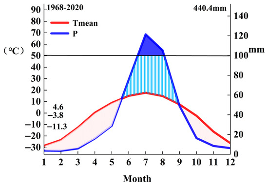 The study area is located in the Chaocha Primeval Forest Region of the Northern Greater Khingan Range in Inner Mongolia (Figure 1), which represents the core area of the northern section of the range, with an elevation of 848 m and geographical coordinates of 50°54′21″ N, 121°30′34″ E. As a critical extension of the Eurasian taiga belt, the Greater Khingan Range constitutes a key component of the Eurasian boreal coniferous forest ecosystems and is recognized as a global hotspot for carbon cycle research [33]. Influenced by both continental monsoon climate and high-latitude cold–humid conditions, the Chaocha Primeval Forest Region has a mean annual temperature of approximately −3 °C and annual precipitation ranging from 450 to 550 mm, with about 70% of precipitation occurring during the growing season (June–August). The seasonal dynamics of temperature and precipitation are illustrated in Figure 2 (Walter–Lieth climate diagram), where the blue curve represents the monthly mean temperature (°C) and the green bars indicate monthly precipitation (mm). The diagram clearly shows cold–dry winters (December–February) and warm–wet growing seasons (June–August).