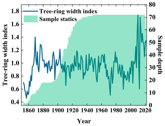 Tree rings are direct, continuous indicators of tree radial growth, which inherently document long-term carbon accumulation in forest ecosystems’ aboveground biomass [5,6,7]. These natural “recorders” bridge short-term ecological observations and long-term environmental changes, serving as widely used proxies in climate and environmental research to support studies of past climate variability, ecosystem responses to environmental stress, and historical carbon cycle dynamics [8,9,10]. In dendroclimatology and dendroecology, the existing research has extensively applied multiple tree ring parameters, including ring width indices, wood density, and stable isotopes (δ13C, δ18O), to analyze climate change patterns and associated ecological responses across diverse spatiotemporal scales [11,12,13,14,15,16]. Tree ring chronologies, for example, have been used to reconstruct historical drought events and climate conditions. These reconstructions extend climate records beyond the instrumental observation period; provide reliable empirical evidence for assessing drought frequency [17], intensity, and trends under climate change; and support regional water resource management and ecological risk assessment [18,19]. Prior studies confirm tree ring chronologies effectively capture interannual and decadal climate variability, reflect seasonal drought impacts on tree growth, establish tree rings’ utility for high-resolution climate reconstruction, and highlight their potential to predict forest ecosystems responses to future climate scenarios [20,21]. Beyond drought reconstruction, researchers have focused on quantifying the sensitivity of tree ring chronologies to key climate drivers, using long-term ring width chronologies, for instance, to evaluate tree growth–climate relationships across scales [22,23]. This work lays a foundation for tree ring use in climate reconstruction while confirming tree rings’ reliability as high-resolution climate proxies and the spatial representativeness of tree ring-based climate indicators [24,25].