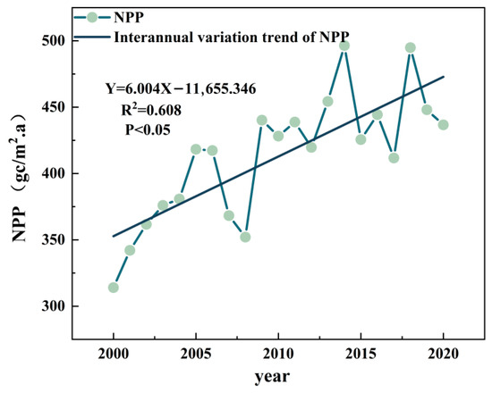Analyzing existing NPP records is critical for guiding regional reconstruction efforts. In the study area, NPP showed a significant increasing trend (linear regression slope = 6.004, p < 0.05), although a notable decline occurred between 2006 and 2009. Over the past two decades, regional ecosystem productivity has increased at an average annual rate of approximately 6 units. This trend is consistent with the enhanced carbon sink capacity observed in other high-latitude regions under global climate change, thereby supporting efforts to achieve “dual-carbon” goals. The interannual variations in observed NPP (2000–2020) and the linear regression fit are presented in Figure 4.