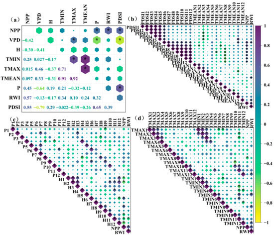 Correlation diagrams of factors and monthly correlations: (a) correlations among factors; (b) correlations of NPP and RWI with PDSI and monthly mean temperature (TMEAN); (c) correlations of NPP and RWI with precipitation (P) and monthly mean humidity (H); (d) correlations of NPP and RWI with monthly mean maximum temperature (TMAX) and monthly mean minimum temperature (TMIN). * indicates p < 0.05.