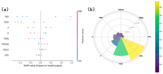 Building on these correlation patterns, we employed a SHAP value analysis to further refine the selection of climate factors, ultimately confirming the tree ring width index (RWI), Palmer Drought Severity Index (PDSI), and precipitation (P) as the final predictor variables for modeling. The contribution of each factor to the NPP model, quantified by mean SHAP importance values, and the directional impact of factor changes on the model output, represented by individual SHAP values, are visualized in Figure 6.