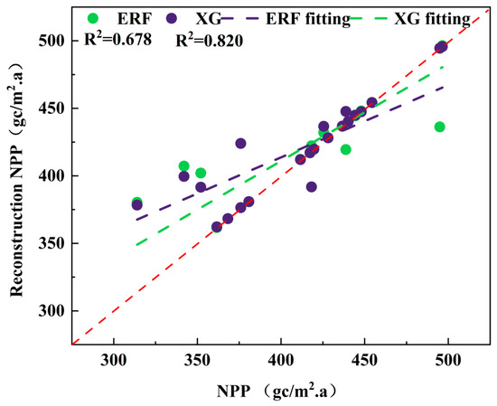 Accuracy comparison of NPP series reconstructed by XGBoost and ERF models. The red dotted line represents the 1:1 line.