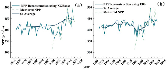 We then applied both the Extreme Random Forest (ERF) and eXtreme Gradient Boosting (XGBoost) models to reconstruct the NPP series from 1968 to 2020. The XGBoost model, which is optimized through gradient boosting, offers superior performance for processing high-dimensional, non-linear data (Figure 7).