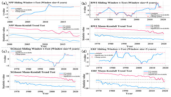 Mutation tests of NPP series and RWI series: (a) sliding t-test and MK mutation analyses of NPP series; (b) sliding t-test and MK mutation analyses of RWI series; (c) sliding t-test and MK mutation analyses of XGBoost NPP series; (d) sliding t-test and MK mutation analyses of ERF NPP series.