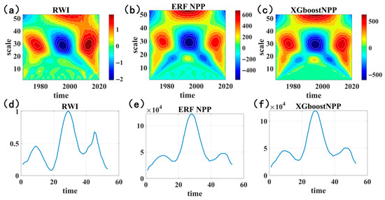 Wavelet real parts and main cycles of reconstructed NPP series and tree ring width series (RWI): (a) wavelet real part of RWI; (b) wavelet real part of ERF-reconstructed NPP; (c) wavelet real part of XGBoost-reconstructed NPP; (d) main cycles of RWI wavelet real part; (e) main cycles of ERF-reconstructed NPP wavelet real part; (f) main cycles of XGBoost-reconstructed NPP wavelet real part.