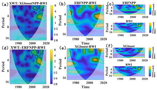 Wavelet coherence diagrams of reconstructed NPP series and tree ring width series (RWI): (a) the XWT wavelet analysis of ERF NPP and RWI series; (b) the wavelet analysis of ERF NPP and RWI series; (c) wavelet coherence cycles of ERF NPP and RWI series; (d) the XWT wavelet analysis of XGBoost NPP and RWI series; (e) the wavelet analysis of XGBoost NPP and RWI series; (f) the wavelet coherence cycles of XGBoost NPP and RWI series. The black area represents the significant coherence interval.